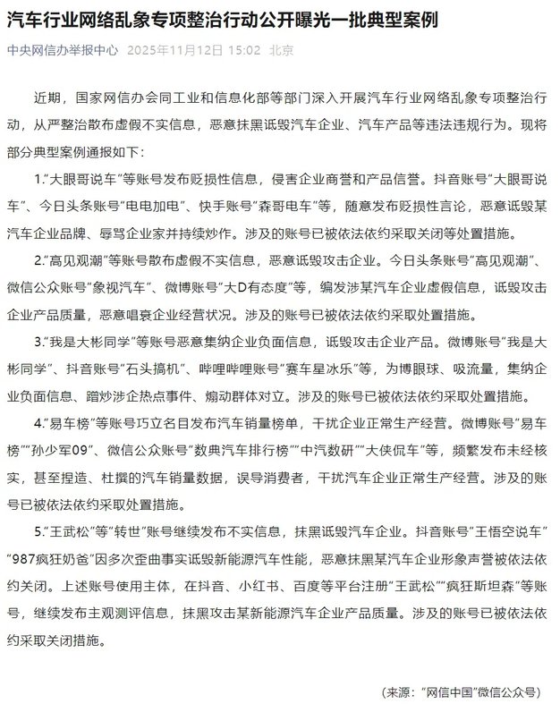 此前,中央网信办在《汽车行业网络乱象专项整治行动公开曝光一批典型案例》中就曾点名,抖音账号“王悟空说车”“987疯狂奶爸”因多次歪曲事实诋毁新能源汽车性能、恶意抹黑车企形象,已依法依约关停。