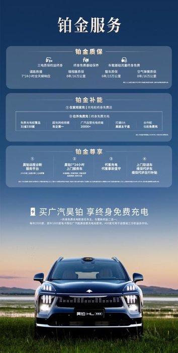 除了购车礼遇,广汽昊铂更为用户提供“铂金服务”保障,提供终身三电质保、终身免费充电等涵盖质保、补能、服务的多维度权益,打造无忧用车体验。