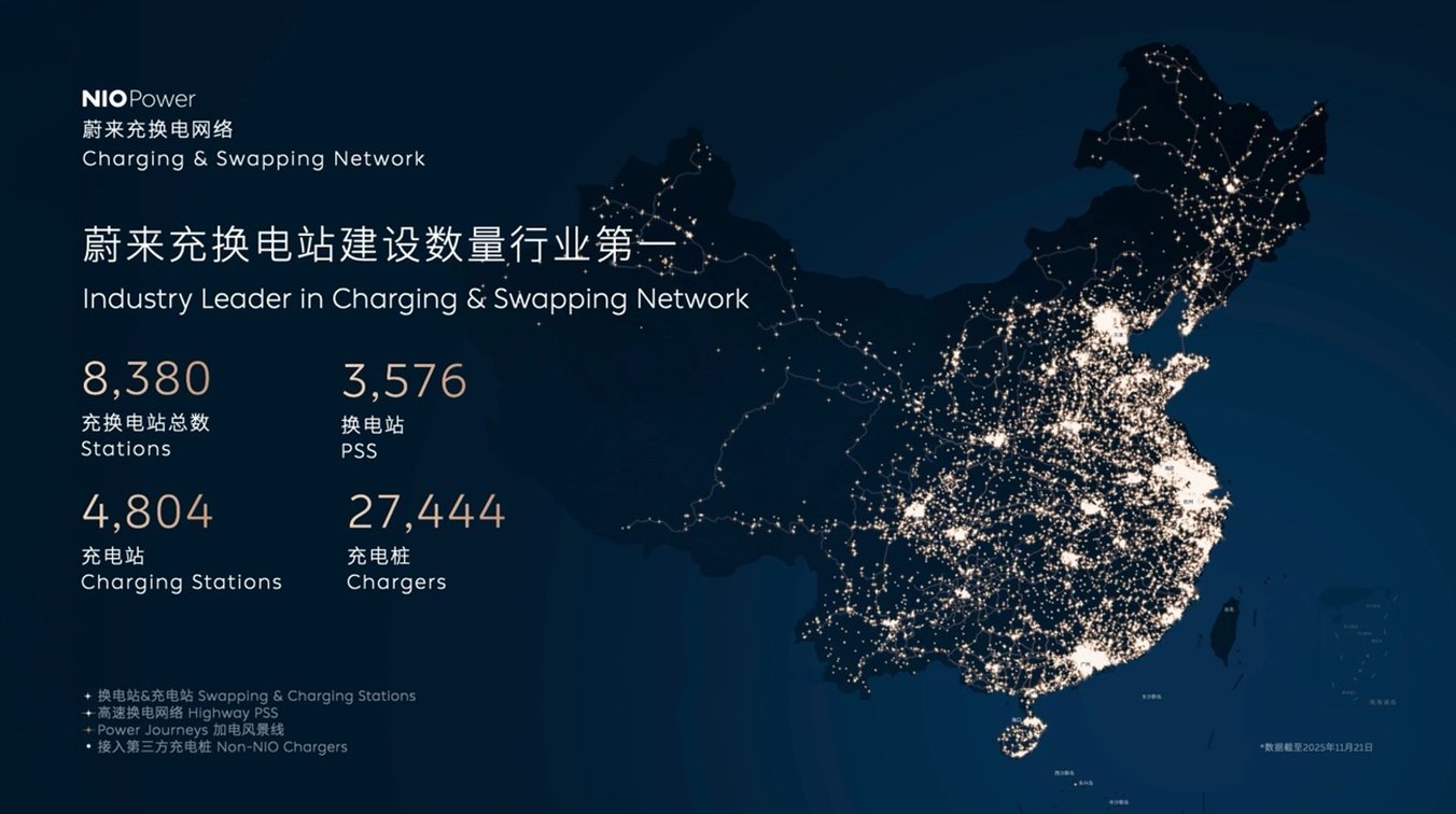 蔚来坚持在补能基建上持续投入,致力于构建全球最强补能网络。截至2025年11月21日,蔚来在全国已布局充换电站8,380座,其中换电站3,576座、充电站4,804座,充电桩27,444根,建设数量行业第一。