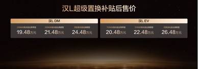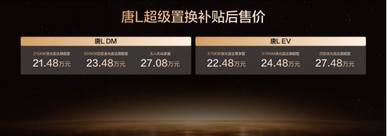 此次,汉L EV 3款车型,超级置换补贴后售价20.48万~26.48万元;汉L DM 3款车型,超级置换补贴后售价19.48万~24.48万元;唐L EV 3款车型,超级置换补贴后售价22.48万~27.48万元;唐L DM 3款车型,超级置换补贴后售价21.48万~27.08万元。同时,比亚迪还为用户准备了包含置换补贴在内的至高价值5.2万元(汉L)/4.5万元(唐L)尊享礼遇。(以上权益截至12月31日)