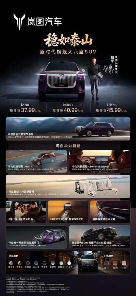 岚图泰山背靠东风56年造车底蕴,是岚图顶级整车技术与华为智能科技的集大成者,它将以泰山般的气度,重新定义大六座豪华SUV的设计、驾控与安全标准。