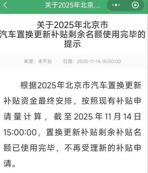 11月14号15点,北京市汽车置换补贴名额剩余剩0辆!