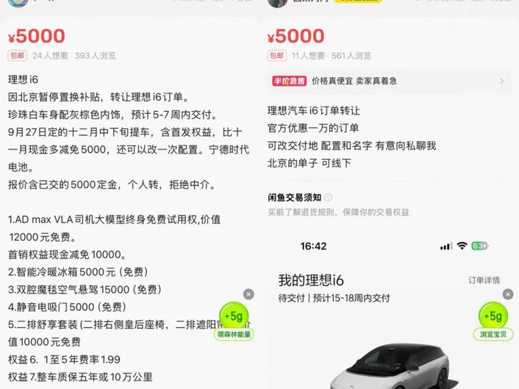 当他在闲鱼上发布转单信息时,才发现自己早已陷入“转单大军”的重围。打开闲鱼搜索“理想i6 转单”,密密麻麻的转单信息扑面而来,“理想i6订单转让,北京地区,可小刀”“急转理想i6准现车订单,补贴没赶上,亏本出”王杰注意到,最早的转单信息发布于10月初,而11月14日后,转单数量激增了近三倍。