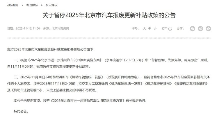 事实上,进入2025年10月以来,全国多地密集宣布暂停汽车报废更新和置换补贴政策,一场覆盖全国的补贴“停摆潮”悄然来袭。