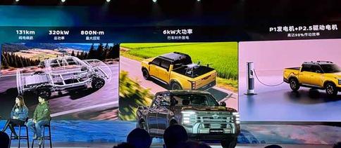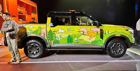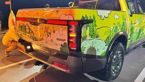 新车侧面,彰显出皮卡的宽大车身结构,整车多以方正的线条修饰,深色的包围将整车的户外属性进一步提升,车顶还设置有行李架,方便后期拓展。车身尺寸方面,燃油/柴油版长宽高为5520×1960×1950mm,插混版为5494×1960×1950mm,轴距统一为3300mm。