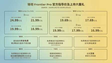 发布会上,郑州日产公布了锋坦的官方售价:锋坦Frontier Pro售价区间16.99万元-19.99万元,锋坦Frontier Pro PHEV售价区间18.99万元-24.99万元。为回馈用户支持,郑州日产还同步推出“智联礼、充电礼、炫彩礼、圈层礼、升级礼、金融礼”尊享6重礼,助力广大用户轻松购、放心开。