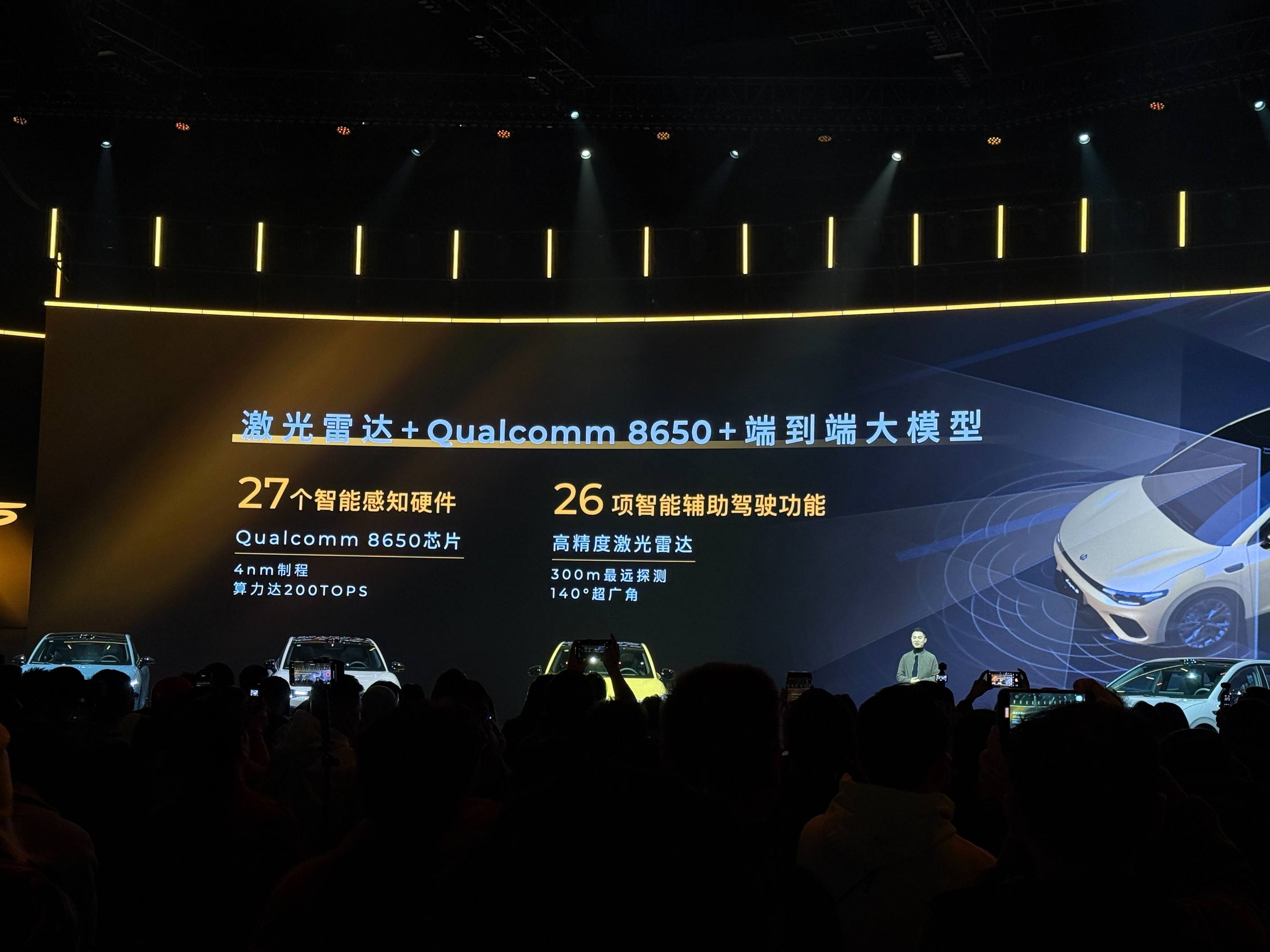 在驾驶辅助系统方面,新车搭载了27个高精度感知硬件,包括1颗激光雷达,使用了高通8650芯片,算力达到了200TOPS,在功能上,支持端到端辅助驾驶功能,可实现高速领航、城区通勤领航功能,未来将通过OTA实现城区领航功能。
