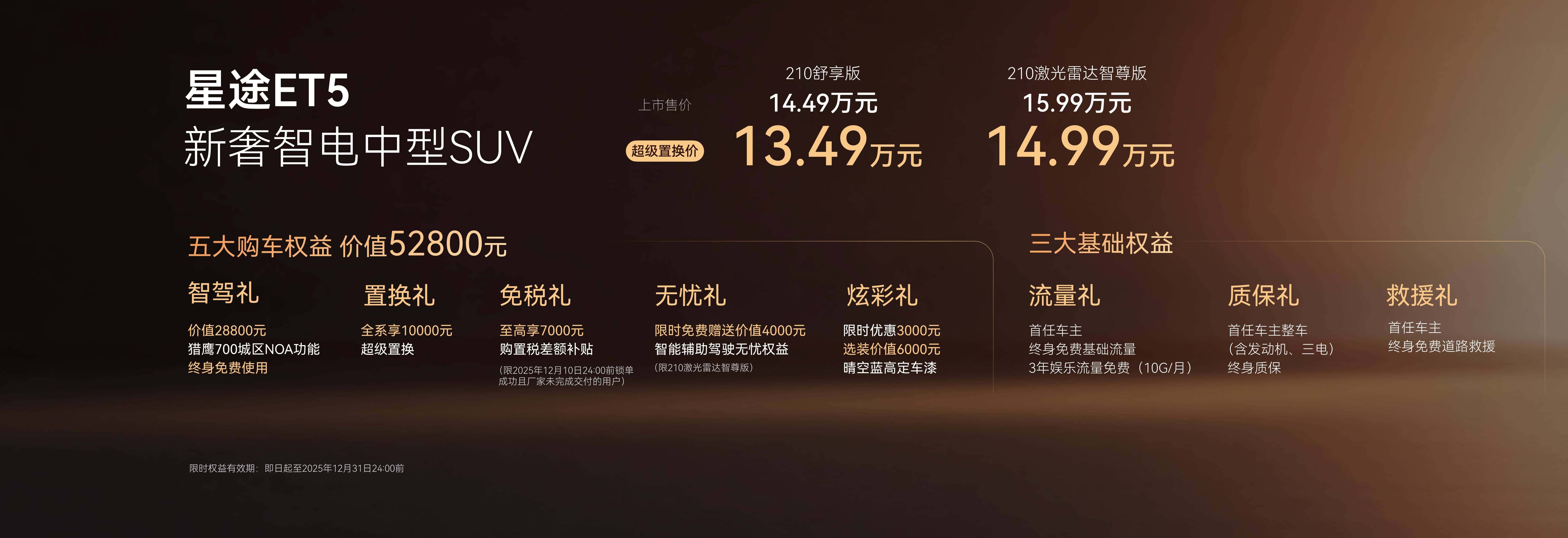 11月28日,星途汽车在珠海发布“新奢智电中型SUV”星途ET5。新车共推出210舒享版、210激光雷达智尊版,官方指导价14.49万元和15.99万元,超级置换价13.49万元和14.99万元,并重磅宣布猎鹰700城区NOA功能终身免费使用。价值52800元五大购车权益、三大基础权益下定即享。