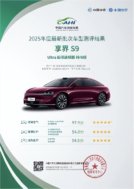 此外,新车还搭载鸿蒙ALPS健康座舱,采用可吸附降解材料、前后双负氧离子发生器、24小时智能新风系统等,抑菌率>99%,新车无异味。11月28日,在中国汽研主导的中国汽车健康指数(C-AHI)最新测评结果中,享界S9凭借其在清新空气、健康防护、绿色出行三个分指数中的优异表现,获得“五星健康车”认证。