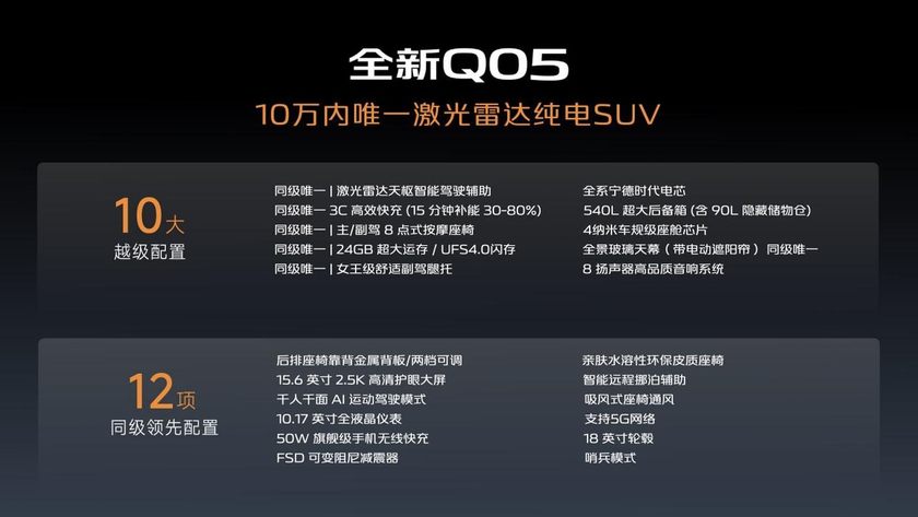 全新Q05以“10万内唯一激光雷达纯电SUV”之姿,打破级别壁垒,将高端智能科技普及化:
