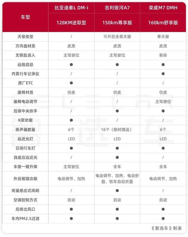 今天我们就拿2026款秦L DM-i 128KM进取型、2025款吉利银河A7 150km尊享版、2025款荣威M7 DMH 160km舒享版,这三款走量的主销版本,从大家关心的价格、空间、动力、配置等方面,聊聊这三款车该怎么选?