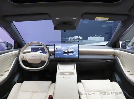 来看内饰,新车前排采用环抱式设计风格,方向盘采用极简风格的双幅式设计,再加上双拼色的组合,营造出不错的视觉效果。材质方面,内饰有着大面积软包包覆,面积达2.8m²,还有256色光瀑式智能氛围灯的点缀,质感很不错。
