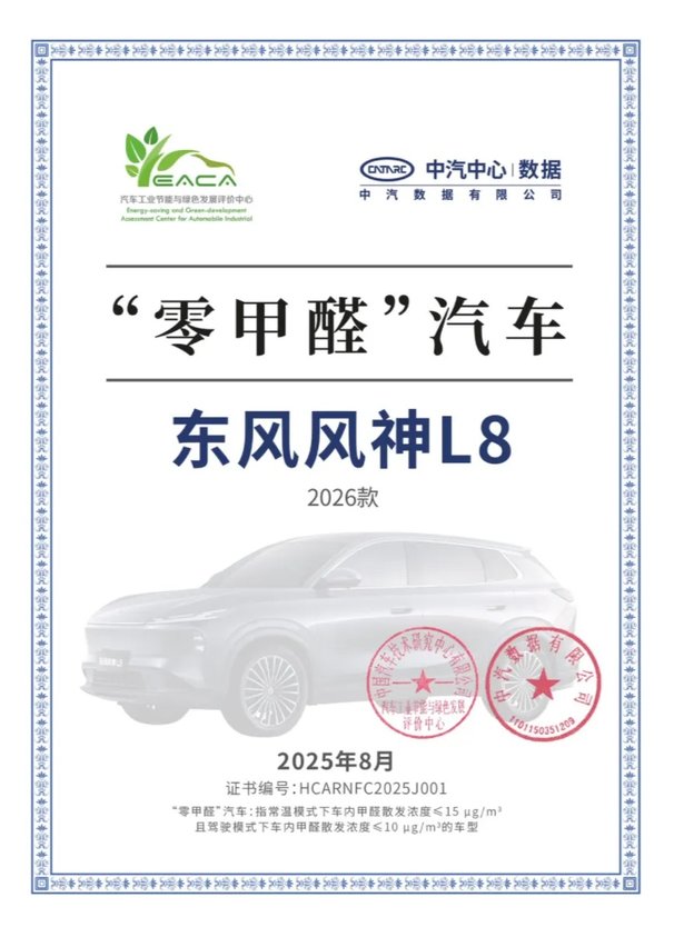 更深层次的舒适,源于对健康的守护。风神L8整车采用高环保材料,从源头杜绝甲醛等有害物质,并荣获中汽中心“零甲醛汽车”的权威认证,配合对标豪车级的NVH静谧工艺,风神L8将“家的味道”与“家的安静”完美融合,为全家营造出身心皆悦的移动空间。
