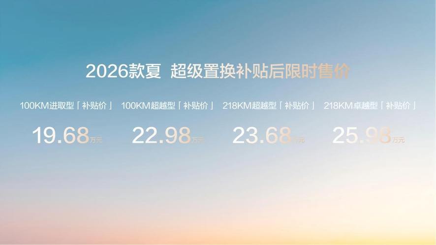 2025年11月4日,2026款夏正式上市,推出4款车型,限时超级置换价19.68—25.98万元,同时还在顶配车型基础上,准备了一个包含AR投影感应开启、副驾娱乐屏、智能香氛系统、迪声28扬音响系统等豪华配置的舒享选装包!此外,2026款夏在车色上做足了功夫,带来了两款价值两万元的定制双色车身,限时价格只要6000元。实实在在的中级SUV的价格,享有超越30万级的豪华配置。