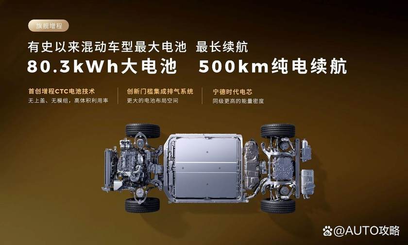 插混式以银河M9、领克900、极氪9X、魏牌蓝山、腾势N9、腾势N8L、仰望U8L以及即将上市的岚图泰山、宝骏华境S等为代表。插混式最大优势为亏电状态下油耗比增程低,高速工况下动力响应快以及发动机直驱效率高。插混式由于油耗低、整备质量、电池电量及油箱尺寸等因素,续航里程也接近、相当或超过增程式。以银河M9为例,其四驱动力系统采用三电机,综合最大功率:640kW,四驱版百公里加速4.5秒。四驱CLTC综合续航1325km,两驱1505km。吉利智能辅助驾驶命名为“千里浩瀚”。“千里浩瀚”基于端到端、VLM、世界模型(World Model)等AI技术构建,同时支持360°全姿态泊车、无图城市NOA全场景、高速NOA与自动泊车APA等功能。 银河M9(17.78/21.68/23.88万元版)配备一颗激光雷达以及千里浩瀚H5级智能辅助驾驶。
