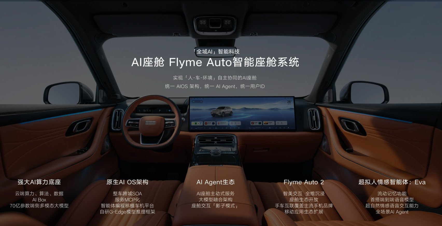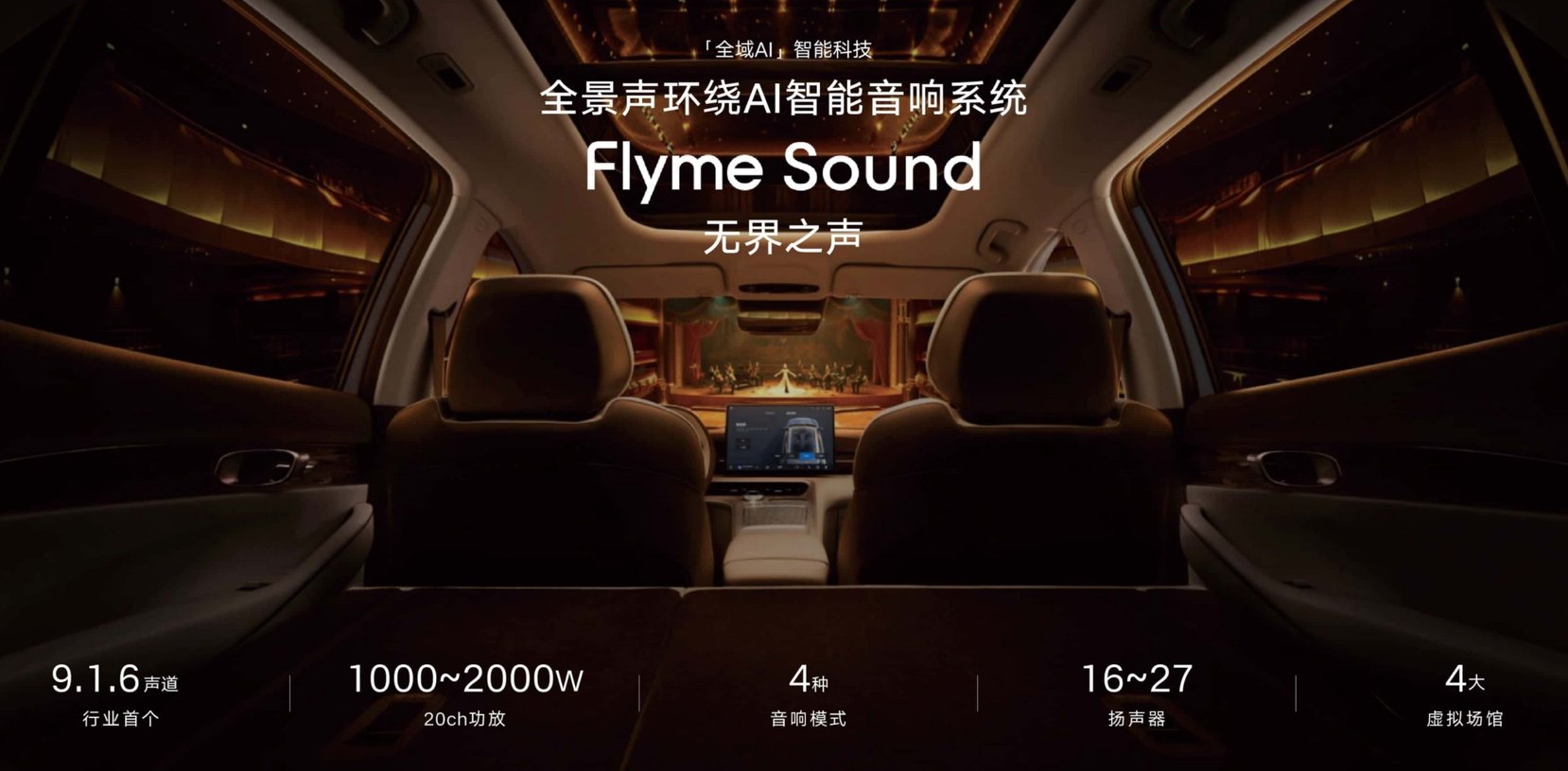 27个喇叭9.1.6声道行业第一;电动一键式5秒内二三排同步向前放平技术形成约2.17m³纯平空间,实现 “上车即躺平”,行业第一;后排电致隐私车窗变色玻璃细分市场第一;原厂(魅族)Flyme Link、 CarPlay、CarLink及HiCar全家桶细分市场第一;9字号9个安全气囊细分市场并列第一。