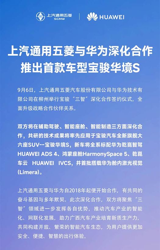 但异常诡异的是,上汽通用五菱与华为确实存在合作的关系,在今年9月份双方也确实签署了深化合作的协议,当时就已经透露共研宝骏全新旗舰六座SUV——宝骏华境S,像华为乾崑智驾ADS 4、鸿蒙座舱5、乾崑车云IVCS等华为技术也明确要上车,甚至还是首批搭载华为舱内激光视觉方案。这恰恰揭示了当前华为与车企合作中一个微妙而关键的真相:拥有华为技术,不等于就是华为的“亲儿子”。