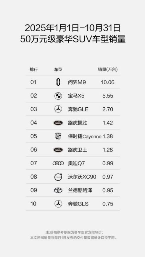 上市至今,问界M9全系累计交付已突破26万辆,并在2025年1-10月,以10.06万辆的累计销量,强势锁定50万级豪华SUV销量第一的地位。这一数字意味着,在曾经由传统豪华长期主导的50万级豪华车市场,问界M9已建立起稳固的市场地位,成为高净值人群信赖与青睐的新选择。