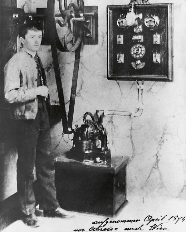 1893 年,费迪南德·保时捷站在他出生地家中自己安装的电气照明装置前,他给整栋房子都布了线。