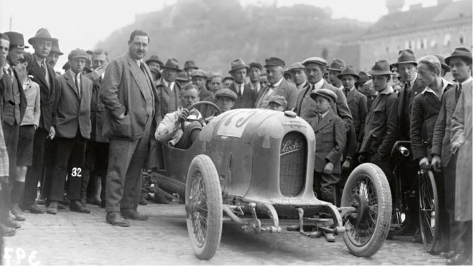 团队协作: 1922 年,Austro-Daimler ADS-R “萨沙”在奥地利的大型赛事中首次亮相便创下最佳成绩。亚历山大·“萨沙”·科洛拉特伯爵站在车手查尔斯·贝塔克(Charles Bettaque)左侧,车右侧可见费迪南德·保时捷与儿子费利。