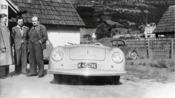 1948 年,费迪南德·保时捷与儿子费利以及设计师埃尔温·科门达(从右至左)站在有史以来制造的第一辆保时捷汽车——356 “No. 1” Roadster 前。