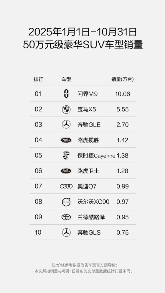 上市至今,问界M9全系累计交付已突破26万辆,并在2025年1-10月,以10.06万辆的累计销量,强势锁定50万级豪华SUV销量第一的地位。这一数字意味着,在曾经由传统豪华长期主导的50万级豪华车市场,问界M9已建立起稳固的市场地位,成为高净值人群信赖与青睐的新选择。