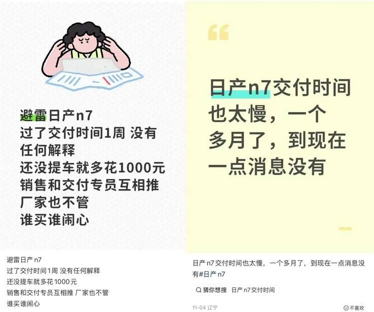 新车交付不及时,消费者的耐心没了,就从粉丝变成“黑粉”。在小红书等社交平台,许多消费者陆续反映N7未及时交付车辆的问题,提到车的车主,也吐槽车身质量、操作系统各种问题。N7采用Momenta一段式端到端飞轮大模型,支持L2级智驾系统。但从社交媒体上用户的反馈来看,在识别和决策逻辑上,日产N7还有较大的提升空间。
