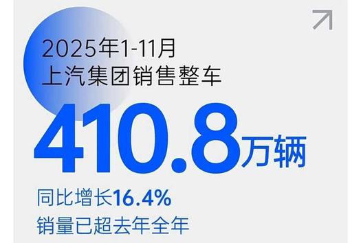 根据最新发布的销量数据显示,今年1-11月,上汽集团累计销售整车410.8万辆,不仅同比增长16.4%,更已超越去年全年总销量!