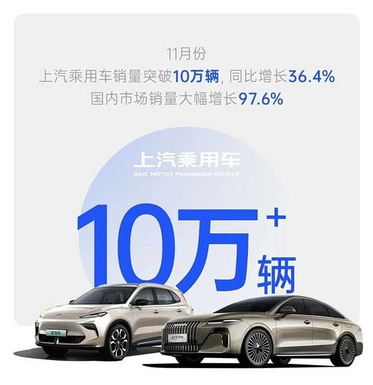 上汽乘用车11月销量突破10万,国内销量近乎翻倍,暴涨97.6%,势头惊人。
