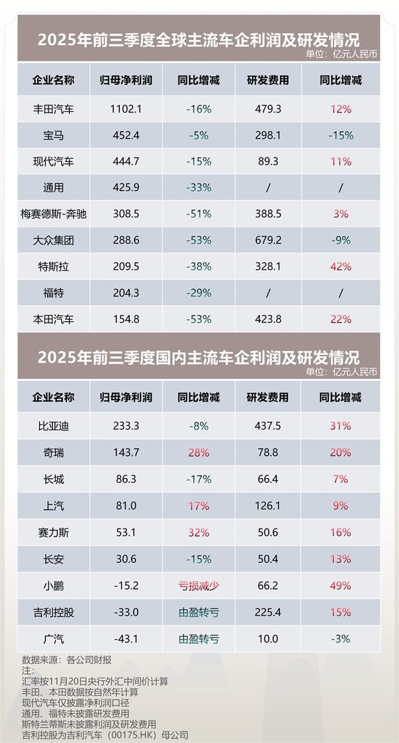 中外车企业绩“冰火两重天”背后,中国车企在智电转型中持续研发投入所形成的技术先发优势,是其实现阶段性突围的关键助推器之一。各家主流车企的三季报显示,国内头部大厂前三季度研发费用的涨幅普遍高于国际巨头,大多保持两位数增长,其中比亚迪投入达437亿元,同比增长31%。而海外车企受制于全球业绩压力,整体增速明显放缓,大众、宝马出现9%和15%的下滑。