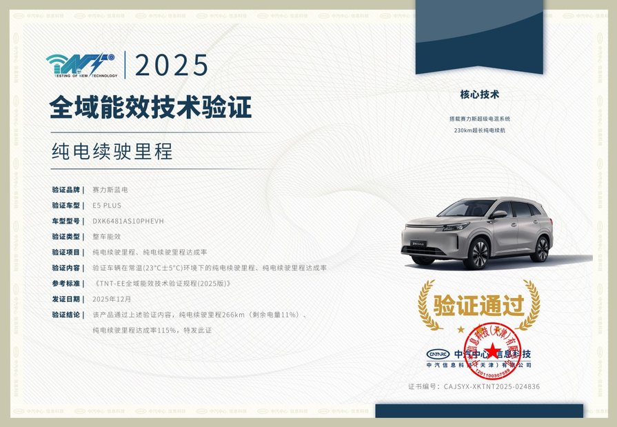 搭载35.95kWh大容量电池和赛力斯超级电混系统,官方CLTC纯电续航达230km,中汽中心常温实测更是高达266km,达成率115%,堪称“反向虚标”的典范。