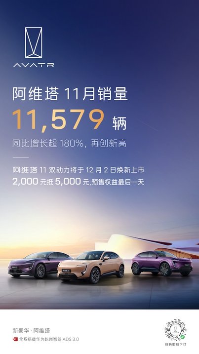 12月1日,阿维塔科技宣布,11月销量达11579辆,再创历史新高。销量连续破万,既有阿维塔07双动力这一主力军的加持,也有阿维塔12双动力这一新生力的助推。此外,阿维塔11双动力将于12月2日正式上市,阿维塔将成为唯一一个全系提供纯电和增程双动力选择的高端品牌。