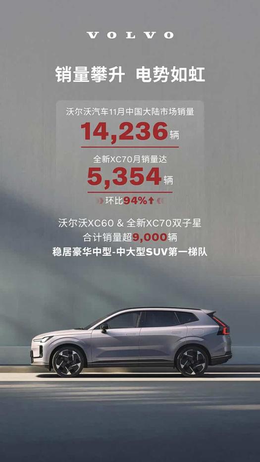 沃尔沃11月在华销量逆袭,新能源占比跃升至43%,标志着其电动化战略已步入收获期。全新XC70等车型的成功及多元化的品牌营销,共同驱动了销量与品牌影响力的同步提升。这不仅是单月业绩的突破,更展现了品牌转型的坚实步伐与在中国市场的持续竞争力。