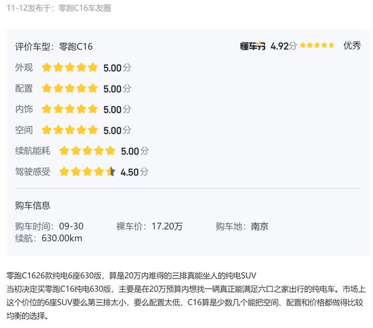 由此可见,零跑C16不是靠堆砌配置取胜的,靠的是敏锐洞察用户需求,精准破解多人出行在空间、续航、舒适性等方面的核心痛点,这是它能在家庭用户中形成“口碑裂变”的关键。