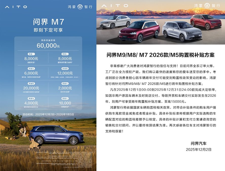 目前,全新问界M7正在持续热销,新车上市41天累计大定突破90000台,68天累计交付破40000万辆,深受用户与市场的认可。为了回馈用户的支持与信赖,问界同步推出至高60000元的购车权益,即日起至2026年1月5日下定即可享受。