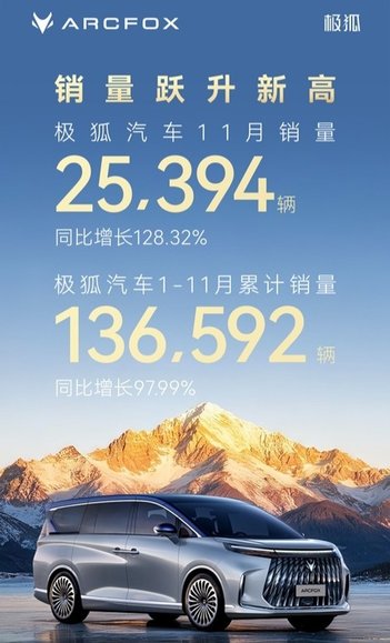 10月,极狐品牌销量突破2.3万辆;11月,这一数字攀升至25394辆,同比增长128.32%。今年1-11月,极狐累计销量已超13.6万辆,同比增长97.99%,妥妥跑赢大盘。