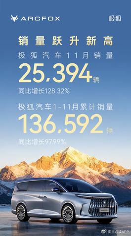 11月,极狐汽车再次交出了一份“2万+”的销量答卷:整月共售出25394台车,同比增长128.32%。