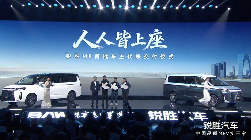 12月5日,锐胜M8正式上市,8款车型,指导价:15.98万元-22.98万元,政策叠加优惠价:12.98万元-19.98万元,同时首批车主交付。