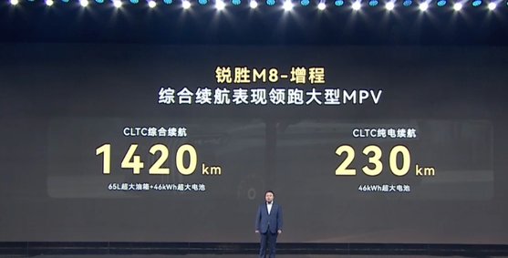 锐胜M8提供增程版、纯电版,满足不同用户需求。其中增程版CLTC纯电续航1420km,纯电续航230km,综合油耗仅3.3L,支持4C超充电,最大充电功率185kW,充电30%-80%仅需10分钟。