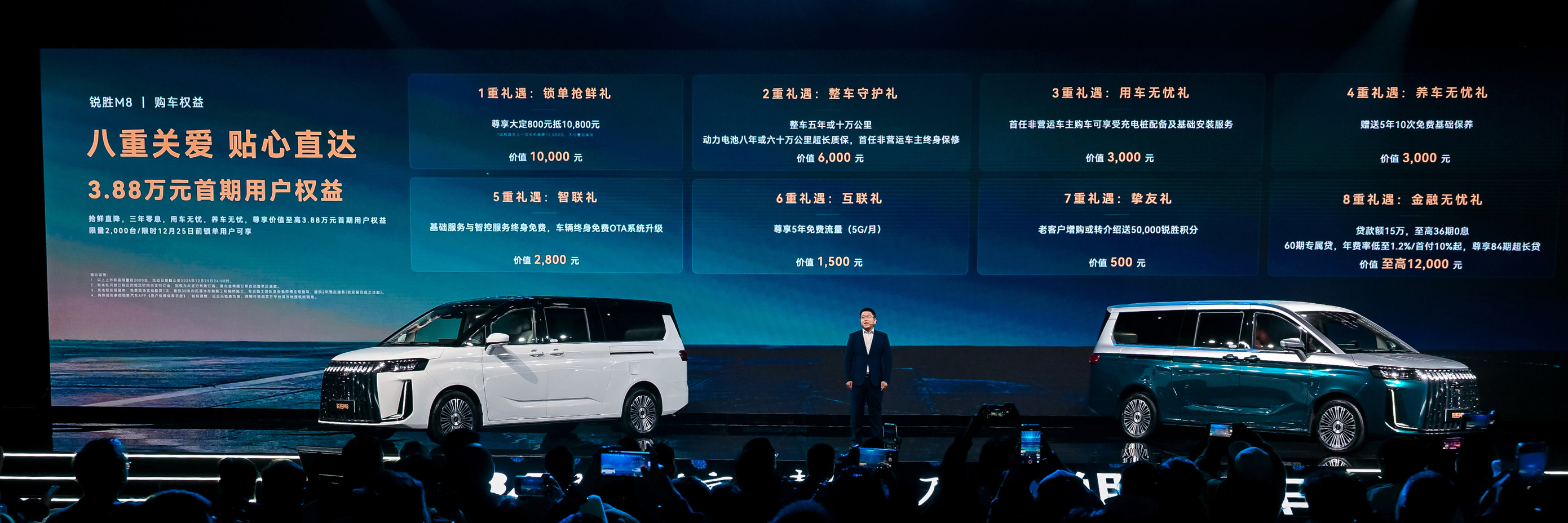 12月5日,锐胜汽车首款全场景舒享大型MPV--锐胜M8正式上市,消费者在享受了用户抢鲜补贴和国补政策之后,其限时补贴售价直接低至12.98万元起。
