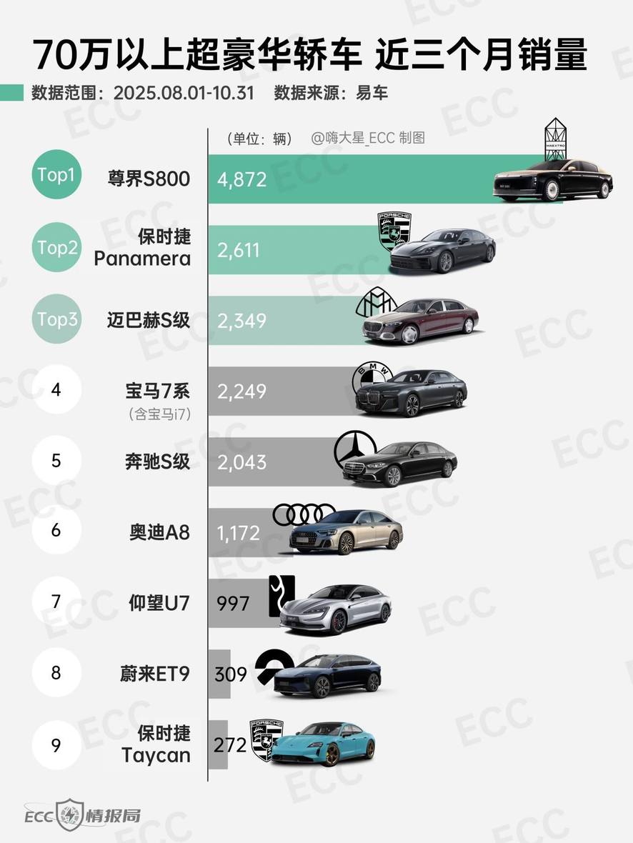 对比定位接近的传统合资豪华,如保时捷帕美、宝马7系、迈巴赫S、奔驰S等,尊界S800在8-10月的销量数据可谓一骑绝尘,三个月合计4872台的销量远超第二名保时捷帕美的2611台。尊界S800的销量表现不仅在同级市场中处于领先水平,也标志着中国超豪华品牌在汽车行业发展进程中取得了重要突破。