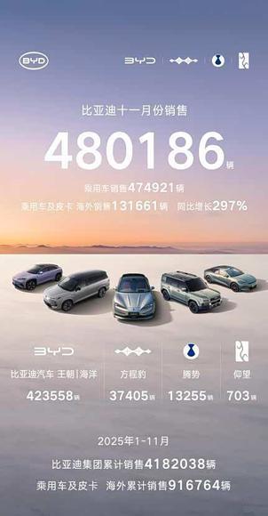 根据数据来看,比亚迪在今年11月的单月销量为480,186辆,创下了其2025年内单月销量的最高纪录。其中乘用车的销量为474,921辆,不仅意味着比亚迪依旧维持强劲势头,而且还反映了其在车型布局和市场相应上的长足进步。