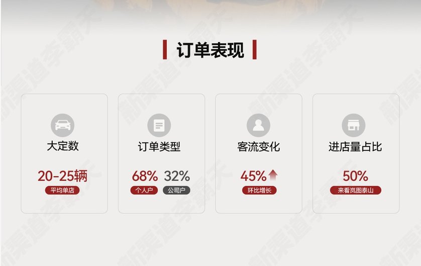 据李霸天调研数据,平均单店大定数20-25台,并凭借泰山产品推动客流环比增长45%,进店客群50%为泰山而来。可谓是一款把声量和体量,都做到了豪华旗舰标杆的产品!