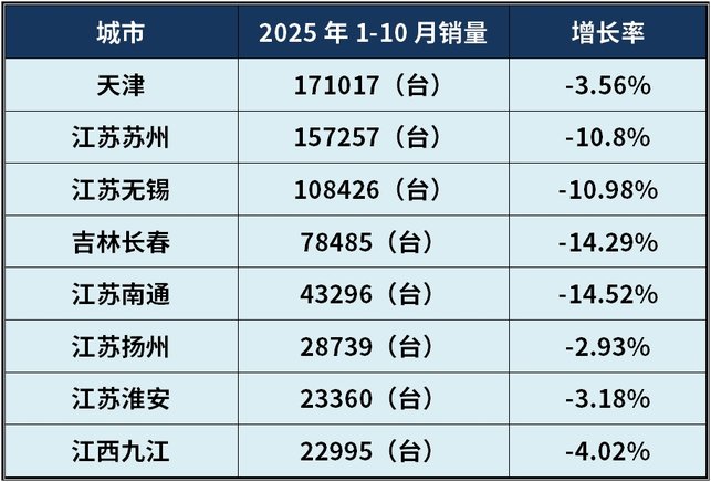 全国乘用车销量查询统计的终端销量数据显示,2025年1-10月,在全国200个城市当中,江苏有五个城市的新能源汽车上险量出现下跌。它们分别是苏州、无锡、南通、扬州和淮安。而其它省份和直辖市,只有天津、吉林长春和江西九江三座城市销量下跌,其它城市均实现上涨。江苏的下跌城市数量,远远高于其它省份,比其它省份和直辖市的下跌城市总和,还要多。