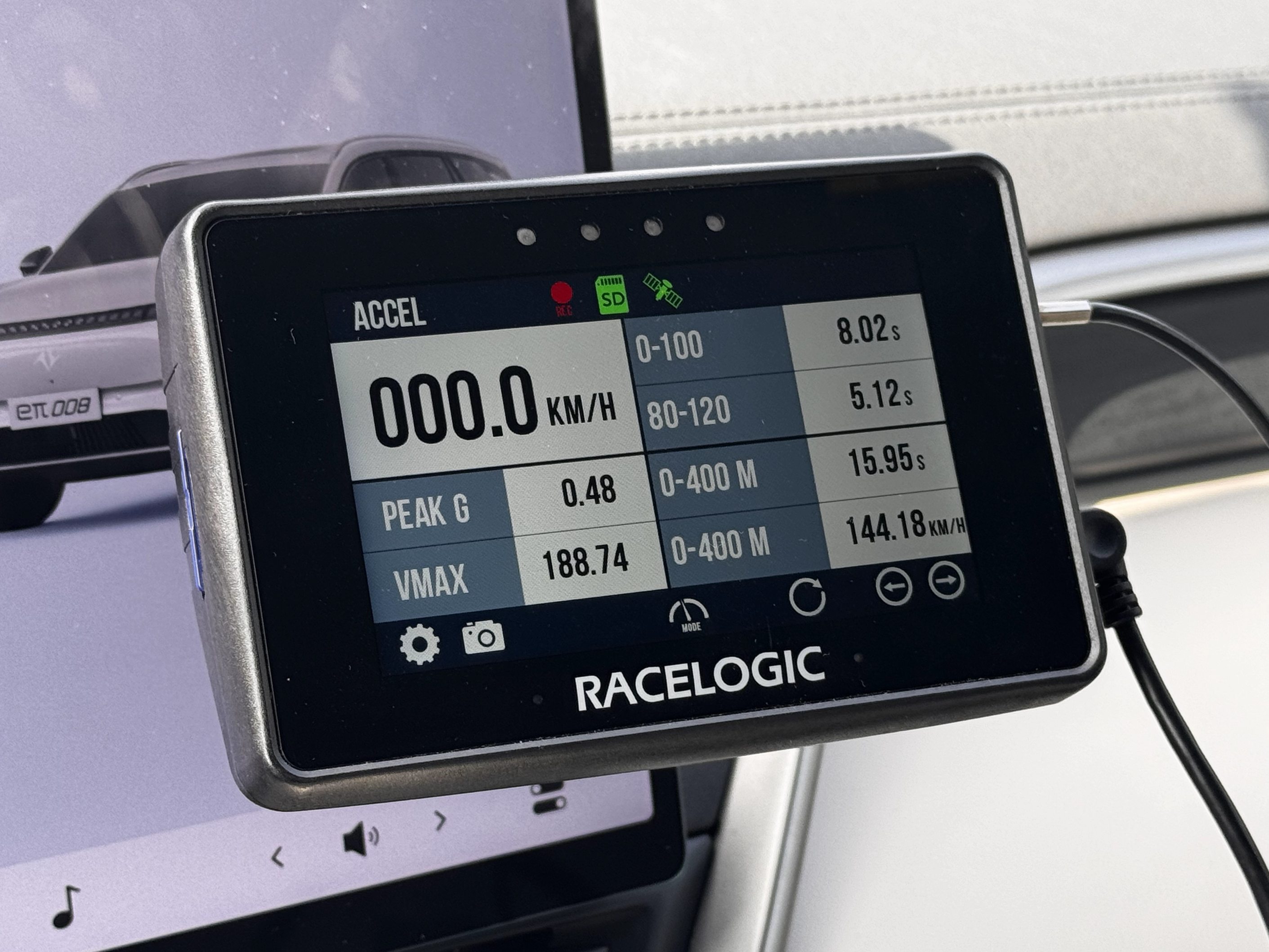 为了验证eπ008的实力,我在封闭道路测试了它的0-400m加速。80%电量下,它的0-100km/h跑出8.02秒,比官方数据几乎快了1秒,而且极速也达到188.74km/h,高于180km/h的官方数据。不过eπ008的0-400m用时15.95秒,冲线车速144.18km/h,比我们此前测试的单电机小鹏G6、岚图知音和特斯拉Model Y都要慢些。