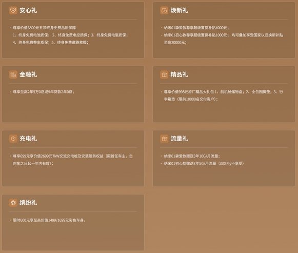 纳米01共推出8款车型,售价区间为5.98-9.28万元,限时焕新售价区间5.88-8.88万元。此外还推出了包括安心礼、焕新礼、金融礼等在内的七大礼包,具体内容可见上图。