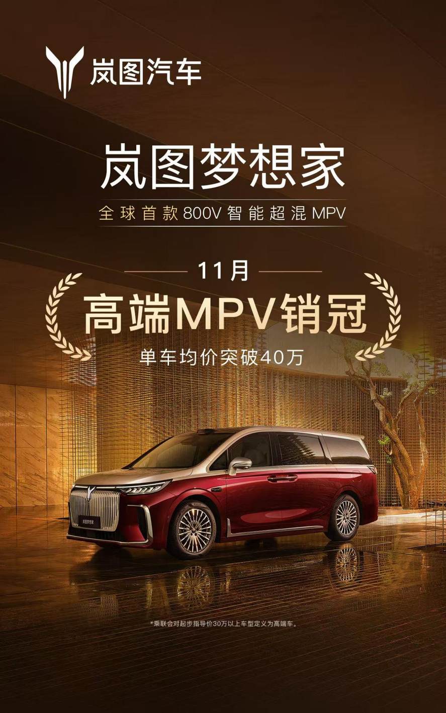 2025年11月高端MPV市场的销量榜单,再次见证了岚图梦想家的强势领跑——9027台的月销成绩让它稳稳蝉联冠军,每卖出3台高端MPV就有1台是它,这样的市场表现足以说明一切。更难得的是,在不少品牌陷入“以价换量”困境时,岚图梦想家始终坚守40万级均价高地,累计销量突破15万台,其中55%的用户来自BBA等传统豪华品牌增换购,这份来自高净值群体的认可,远比单纯的销量数字更有分量。