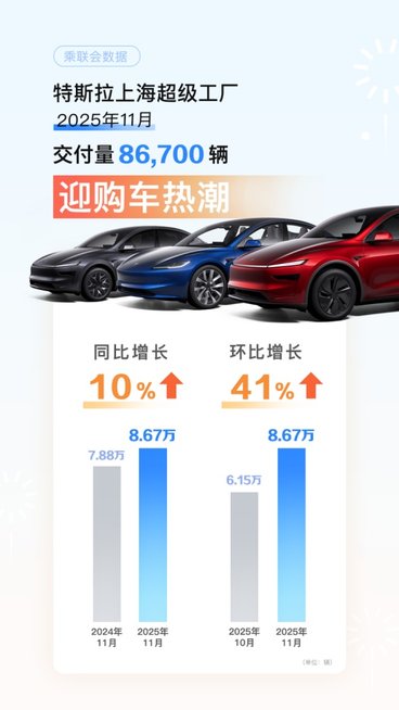 中国乘用车联合会12月2日公布的最新数据显示,11月特斯拉上海超级工厂共交付Model 3和Model Y 86,700辆,同比增长10%,较10月环比增长40%。