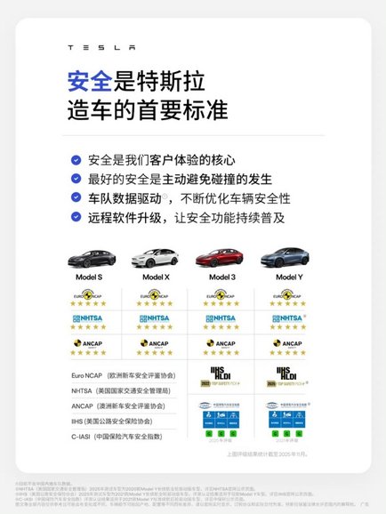近期,现款 Model Y 获得了2025年 Euro NCAP(欧洲新车安全评鉴协会)、ANCAP(澳洲新车安全评鉴协会)“五星安全”评级。作为全球车型,S3XY全系车型满足多个市场严苛标准,已在美国 NHTSA、欧洲 Euro NCAP、中国 C-IASI、澳大利亚 ANCAP 等多个权威机构中获得“五星安全”评级。