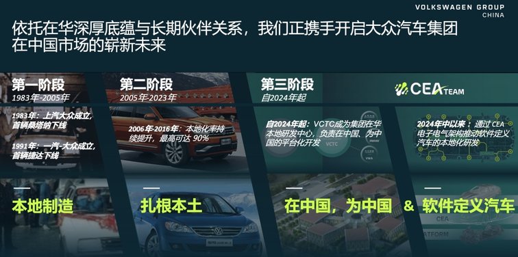 我们知道,大众进入中国40多年以来,第一个阶段是把桑塔纳、捷达这些经典车型引入中国,实现整车本地制造;第二个阶段,是在合资公司内部推进零部件和供应链的深度本地化,形成完整的本地制造能力。